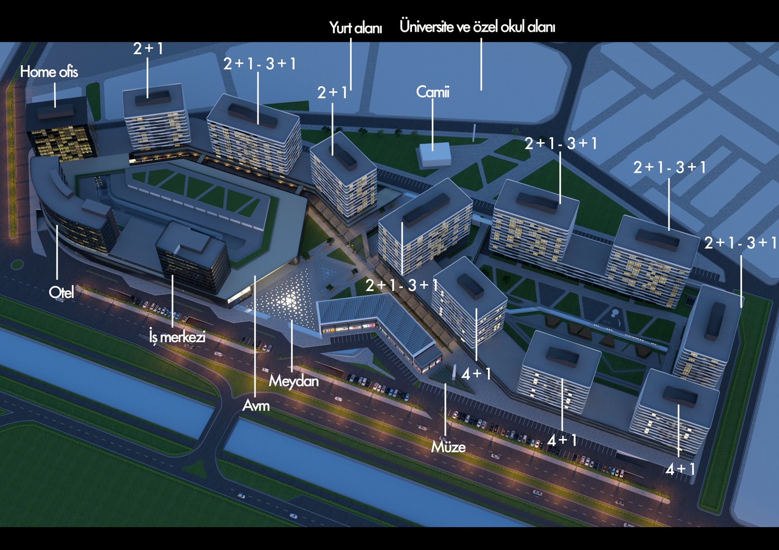 65.500m² arazi üzerinde planlanan projede konut, residence, alışveriş merkezi, otel ve ofis fonksiyonları yer almaktadır.